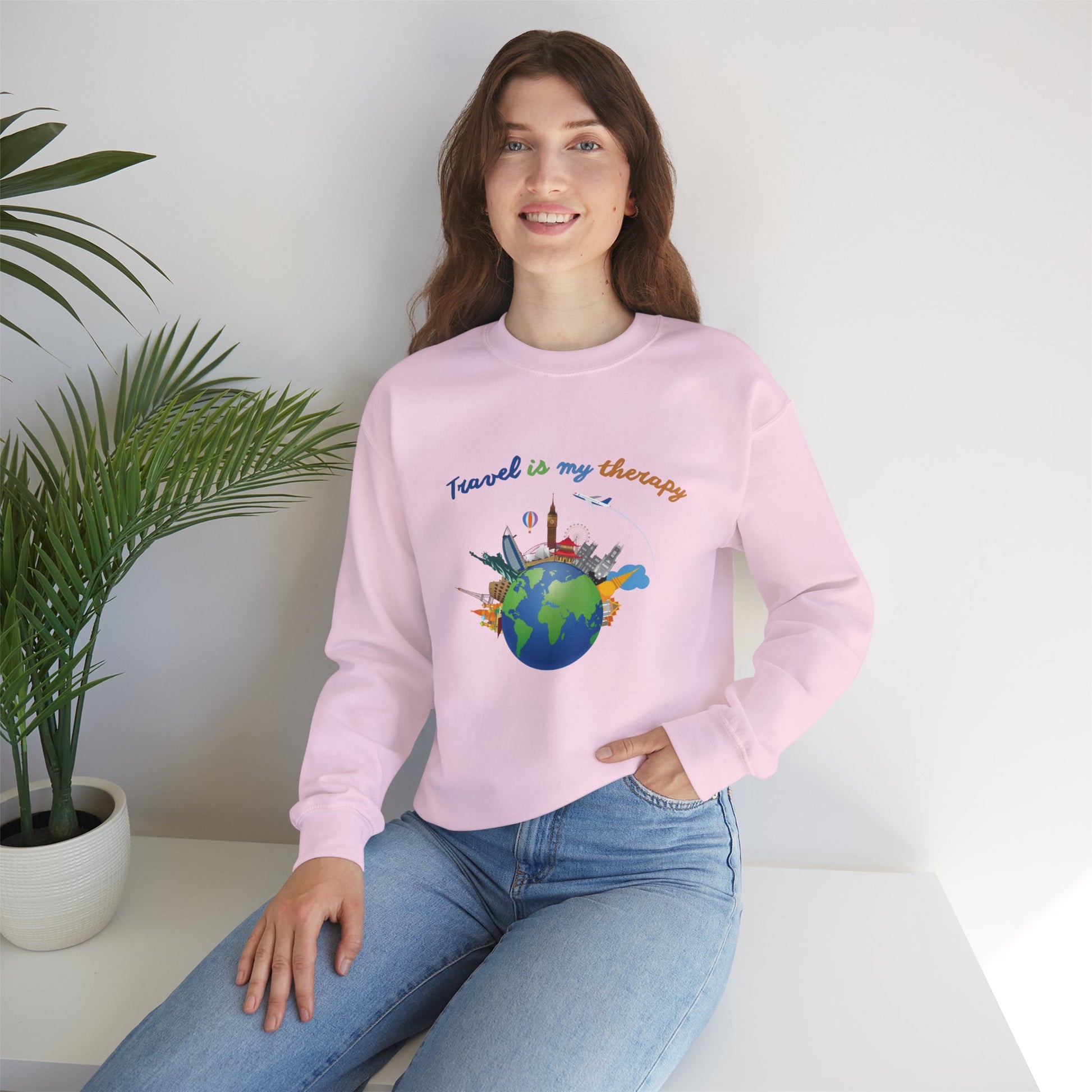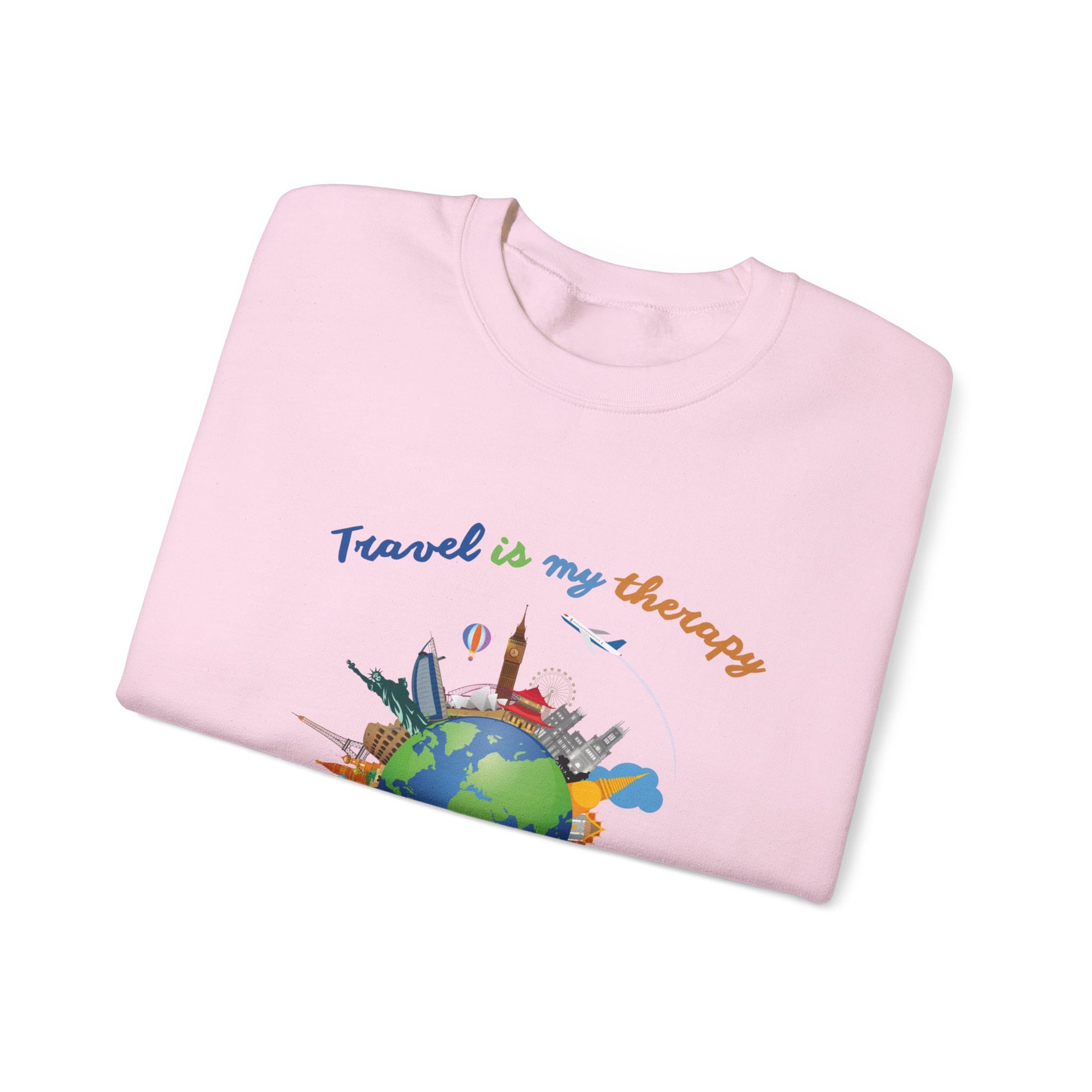 Travel Is My Therapy Sweatshirt — Globe & Landmarks Crewneck for Travelers